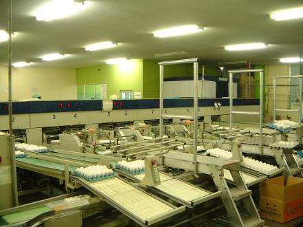 大雛導入については、当方の指定した育成場にて、品種、ワクチネーション、飼育管理を指示し、抗体価によって導入し、当方にて1、2週間の間、育成管理をされて成鶏編入されます。鶏群は25000羽ロット別にて管理されており、完全オールイン、オールアウト制をとっています。製品出荷された鶏卵においては、抗生物質、薬品は全く使用しておりません。各部署で衛生管理を行っており、飼育環境、GPセンター内、鶏卵、飼料のサルモネラ検査を定期的に行なっております。鶏卵は集卵から殺菌洗浄、パック詰めまで洗卵選別機にて、製造されております。 |