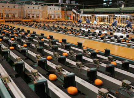 選果場では、一個一個、糖度と酸度を測り、外観と色を調べて、高品質なみかんとなって、お馴染みのミカちゃんマークのダンボールに入って出荷されます。 |